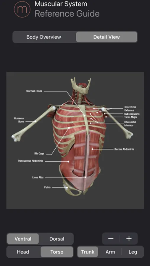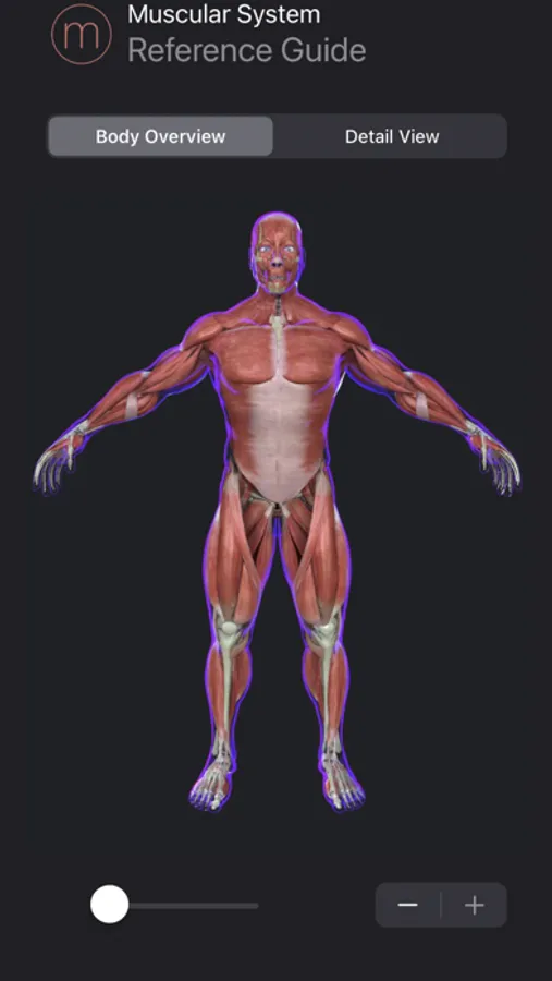 A complete muscle reference guide will teach you the names of 8 layers of muscles. See the muscles in 360 degrees alongside detailed descriptions. A muscle quiz will test your knowledge what you've learned. A progress indicator is included to gauge how many muscle you were able to correctly answer.