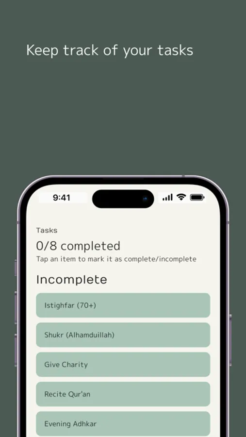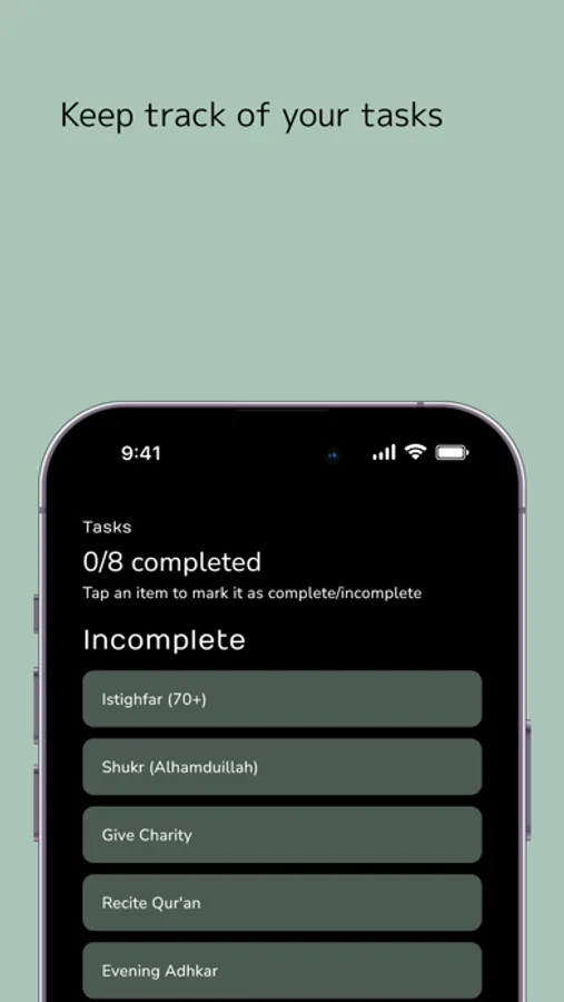 Ramadan Taskminder allows you to stay on top of your tasks for Ramadan. Keep track of your Qur’an reading, prayers, and other key tasks.