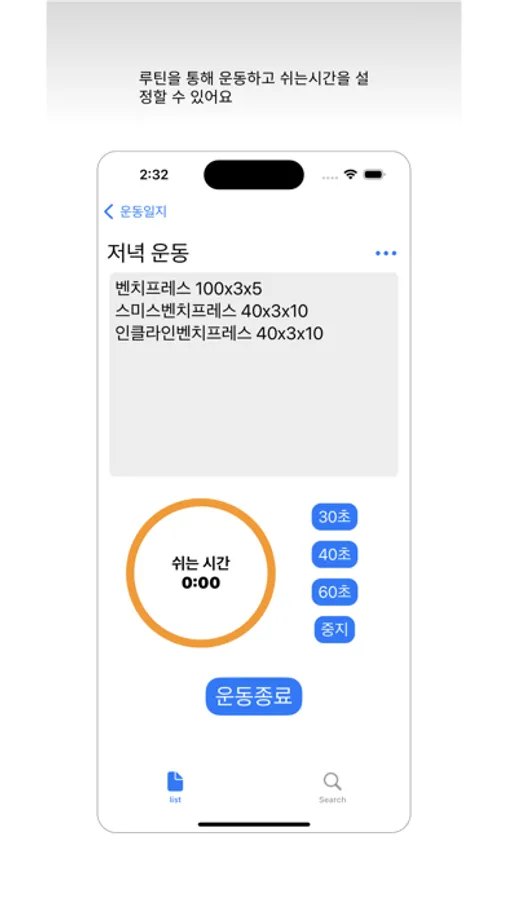 - 만들어진 루틴을 누르면 루틴을 한눈에 보고 운동중 타이머를 통해 쉬는시간을 조절 할 수 있어요
