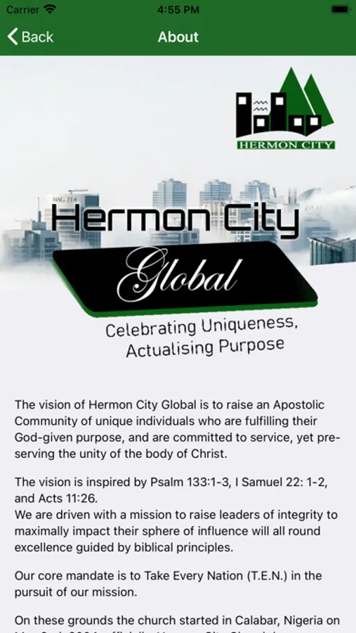 Welcome to the official App of Hermon City Global. The vision of Hermon City Global is to raise an Apostolic Community of unique individuals who are fulfilling their God-given purpose, and are committed to service, yet preserving the unity of the body of Christ.
