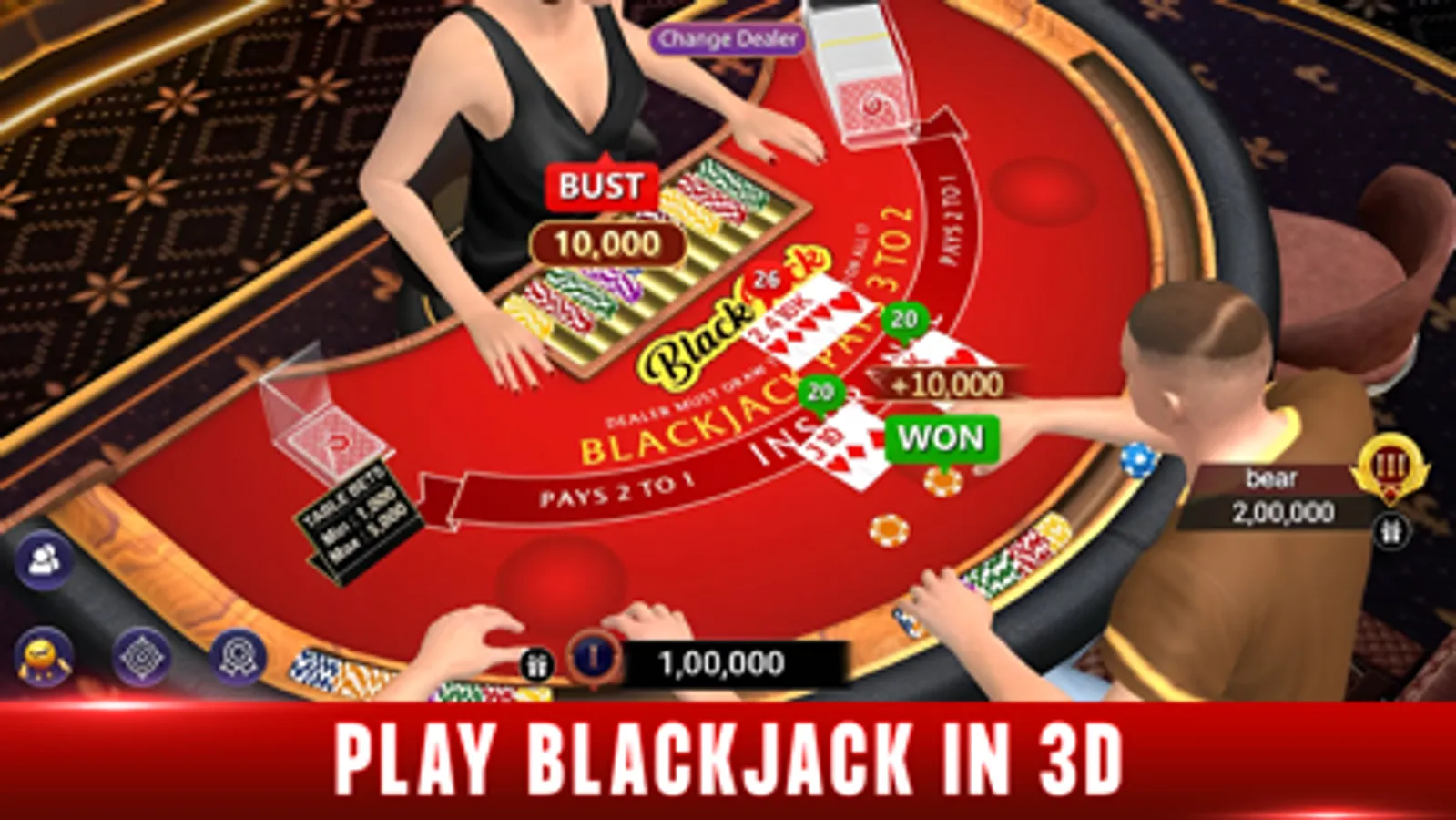 Enjoy 3D blackjack 21 casino games from your own home. A lifelike graphic and intuitive control system create an authentic black jack ambiance. Like in a casino, feel the rush of making strategic decisions. Poker and slots games are also available!