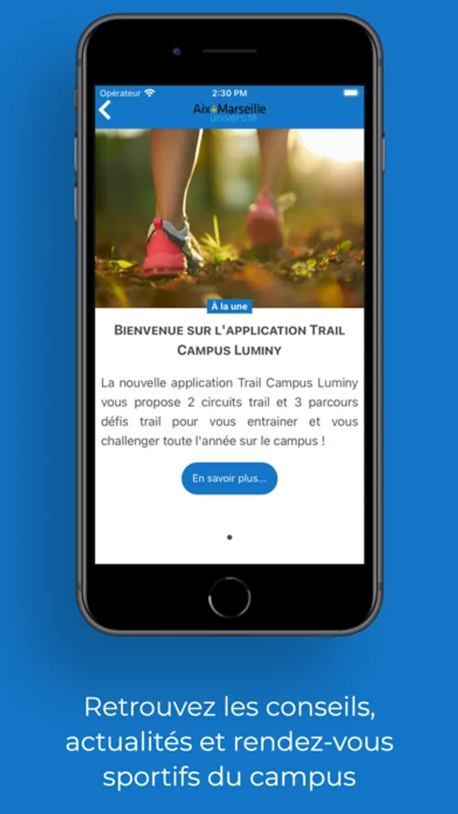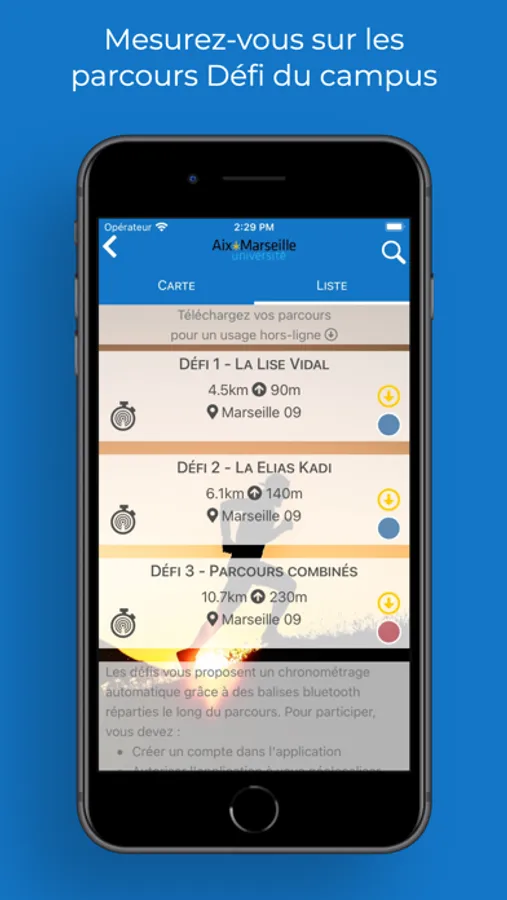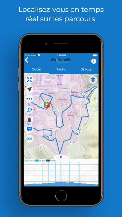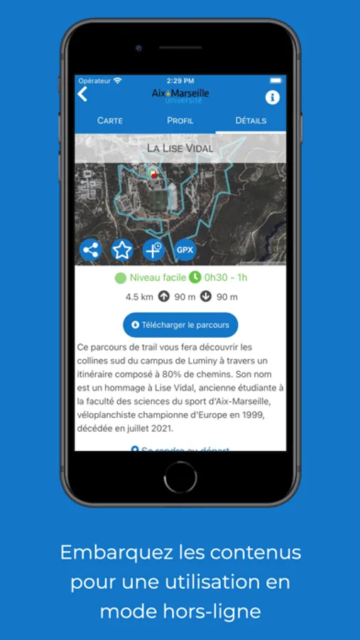 Avec cette application, embarquez les itinéraires trail du Campus Luminy dans votre smartphone. Une fois l'application installée, vous aurez la possibilité de télécharger les cartes et les parcours pour profiter de l'application en mode hors-ligne. De nombreuses fonctionnalités faciliteront vos sorties :