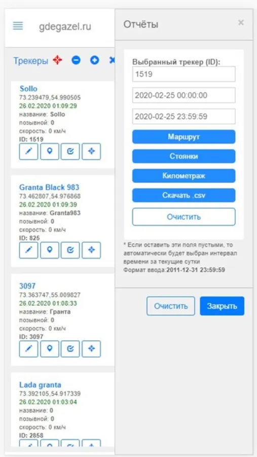 GPS мониторинг транспорта в режиме онлайн. Позволяет авторизованным пользователям контролировать передвижение транспорта, получать отчеты за период (трека на карте, километраж).