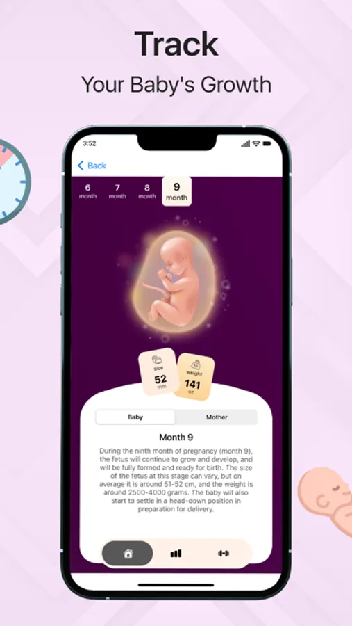 Week by week pregnancy app tracks all pregnancy stages from month one to nine. Mothers can track their fetus size growth and weight change. There are two separate sections for both mother and baby to track all due dates.