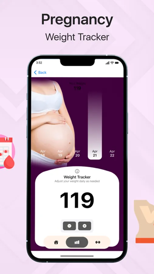 Our pregnancy app has a built-in weight counter that helps to observe the changes in your body. Baby bump keeps growing and you can track your overall weight to check baby growth. Use a pregnancy tracker week by week to adjust your weight as needed.