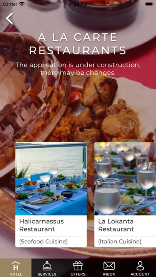 During your stay, you can benefit from Restaurant Reservations, Requesting Room Supplies, Selecting Bedding Options, Reporting Room Problems, Dry Cleaning, Pressing, Wake-up Calls, Housekeeping, Fast Check-in, Pressing, Porter Service, Laundry & Pressing, and Special Request guest services by the Blue Dreams Resort & Spa mobile application. Moreover, you can see and easily request the available offers on the Offers menu.