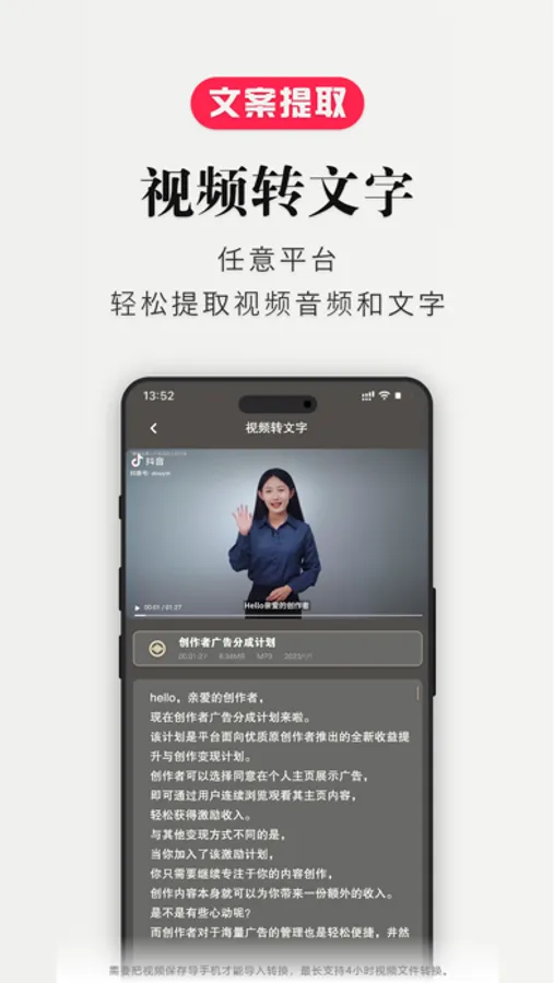 - 视频文件(包括电影、抖音、快手等)转换为文字。