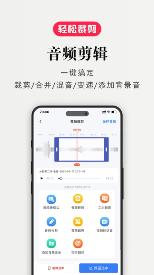 - 支持录音的裁剪、拼接、分割、格式转换以及添加背景音乐等功能。