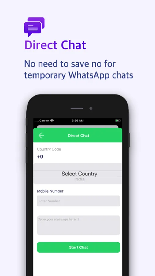 Direct Chat:- No Need to save numbers for a temporary chat on WA, Just select the country code and enter the number and start the chat. How easy is it!