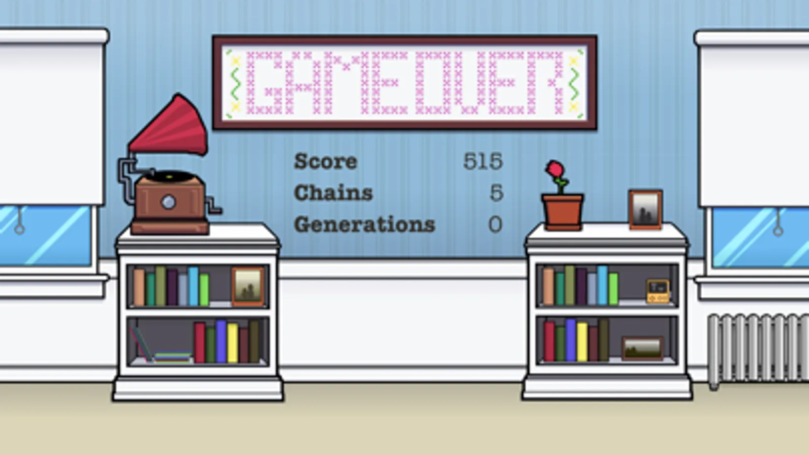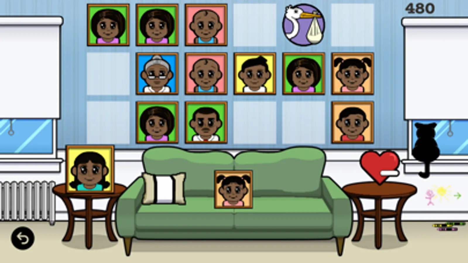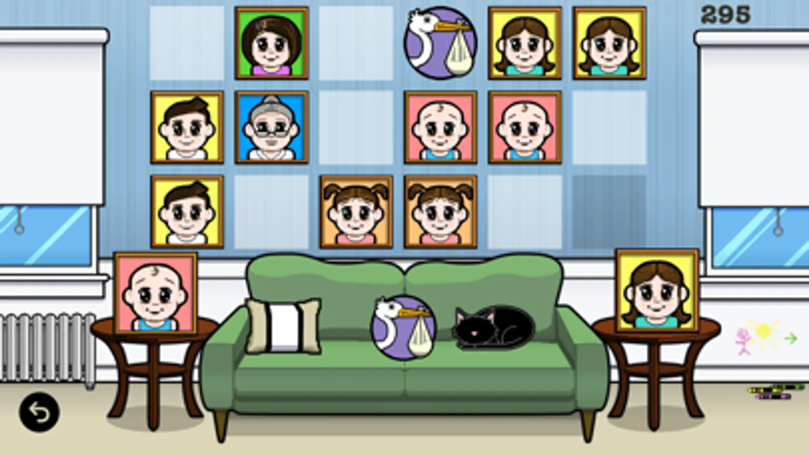 The game begins with storks. Three storks combine into an infant. Three infants turn into a child, and so on until you combine three portraits of the matriarchs and patriarchs of the family. When this happens, you've created a Generation, and all portraits you've hung on the wall will automatically age up and the spaces occupied by the seniors will open back up, ready for a new generation of descendants.