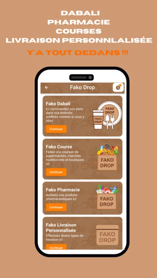 Dabali, pharmacies, courses de supermarchés, marchés traditionnels et boutiques, réservation de livreurs tout y est sur Fako Drop ! Le premier service de livraison made in Côte d’Ivoire à avoir une application mobile digne des plus grands services mondiaux et le premier service de livraison utilisant des motos électriques en Afrique de l'Ouest;