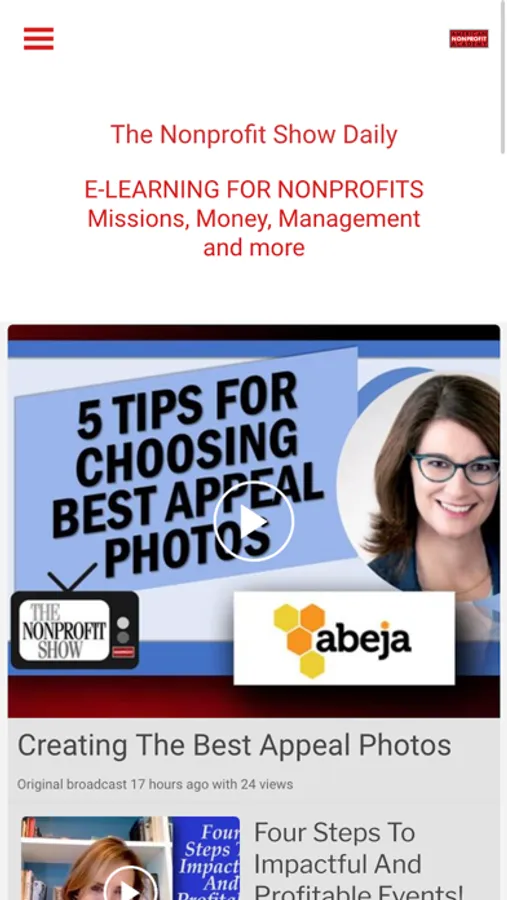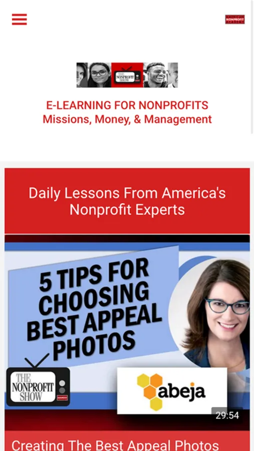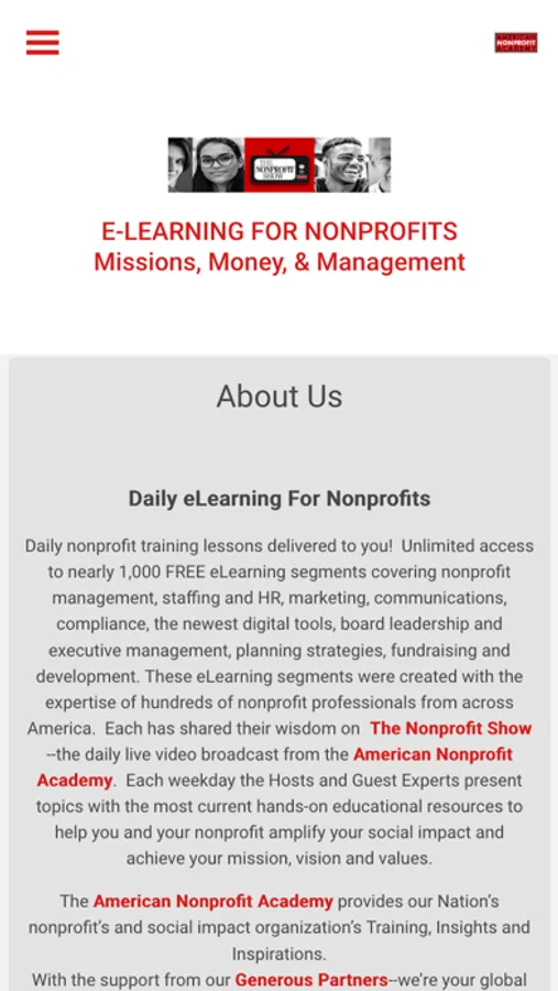 Unlimited access to nearly 1,000 FREE eLearning segments covering nonprofit management, staffing and HR, marketing, communications, nonprofit legal and compliance issues, the newest digital tools, nonprofit board leadership and executive management, planning strategies, fundraising, grants and development. These eLearning segments were created with the expertise of hundreds of nonprofit professionals from across America. Each has shared their wisdom on The Nonprofit Show --the daily live telecast from the American Nonprofit Academy. Each weekday the Hosts and Guest Experts present topics with the most current hands-on educational resources to help you and your nonprofit learn. Download the app and amplify your social impact and achieve your mission, vision and values!