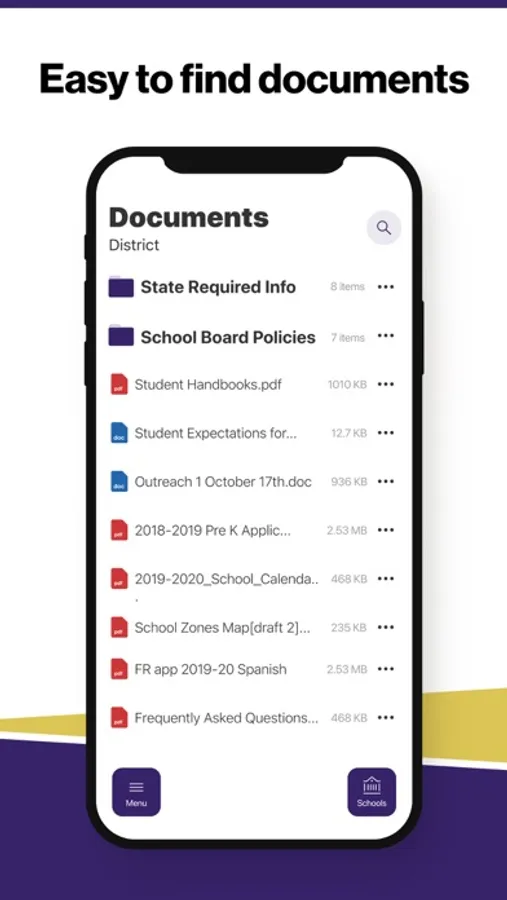 The event section shows a list of events throughout the district. Users can add an event to their calendar to share the event with friends and family with one tap.