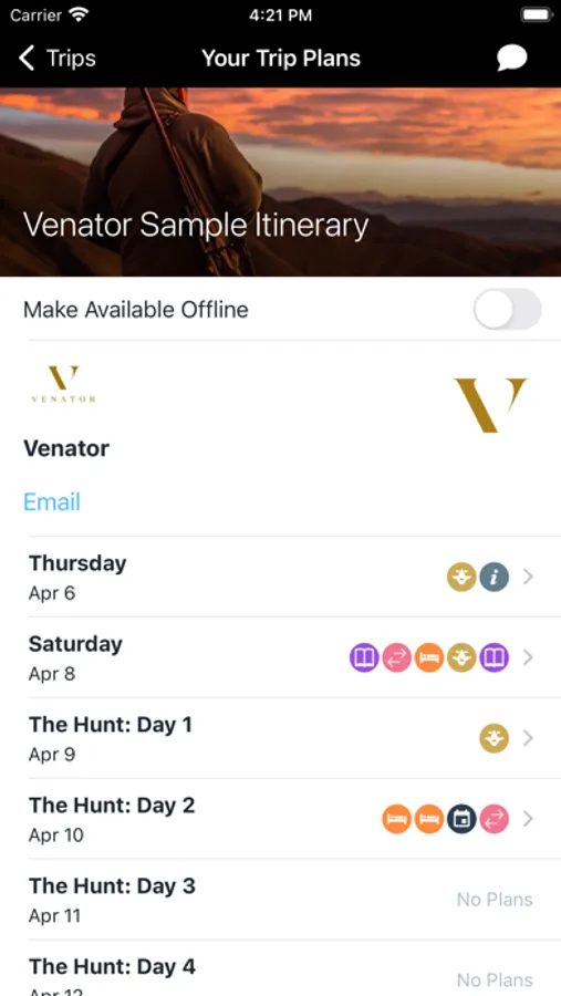 No data or internet connection? No problem, your complete Venator Hunt itinerary and travel plans are still accessible while offline.