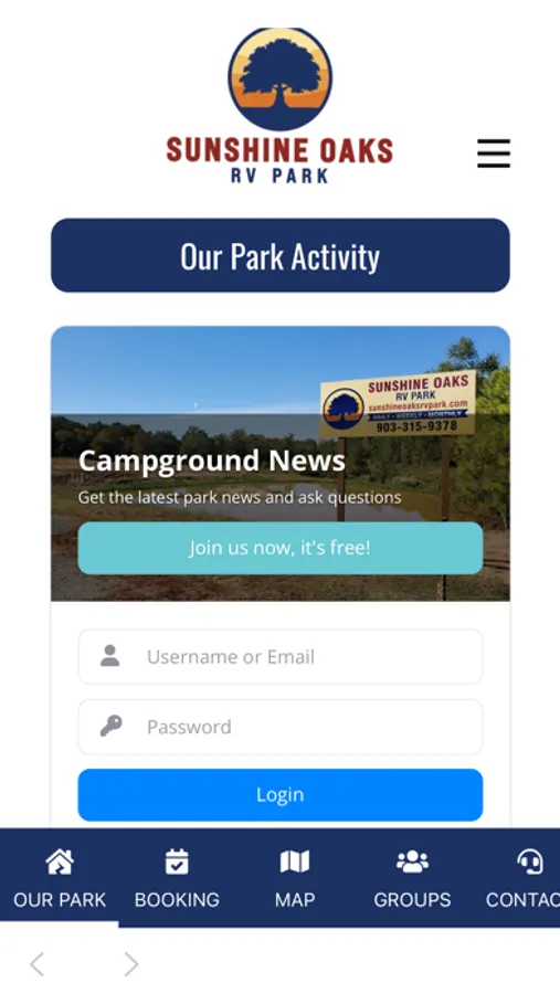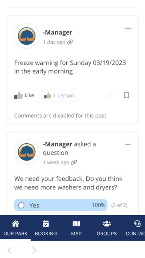 Long-term and all other campers can get the latest news, alerts and notifications about our RV park. Ask questions and make a suggestion to the management. Book time slots for services and rental equipment. Find services and attractions in our area.