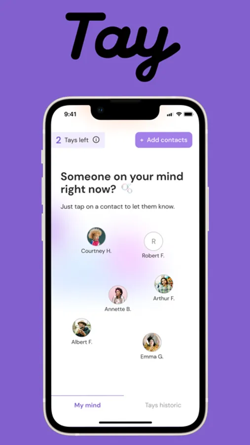 TAY (Thinking About You) est une application qui vous permet de rester connecté avec les personnes qui comptent pour vous.