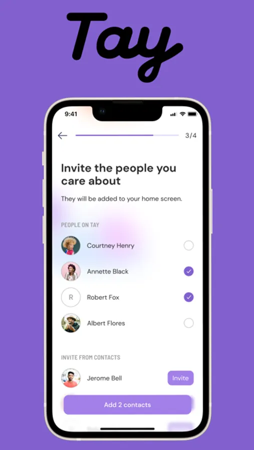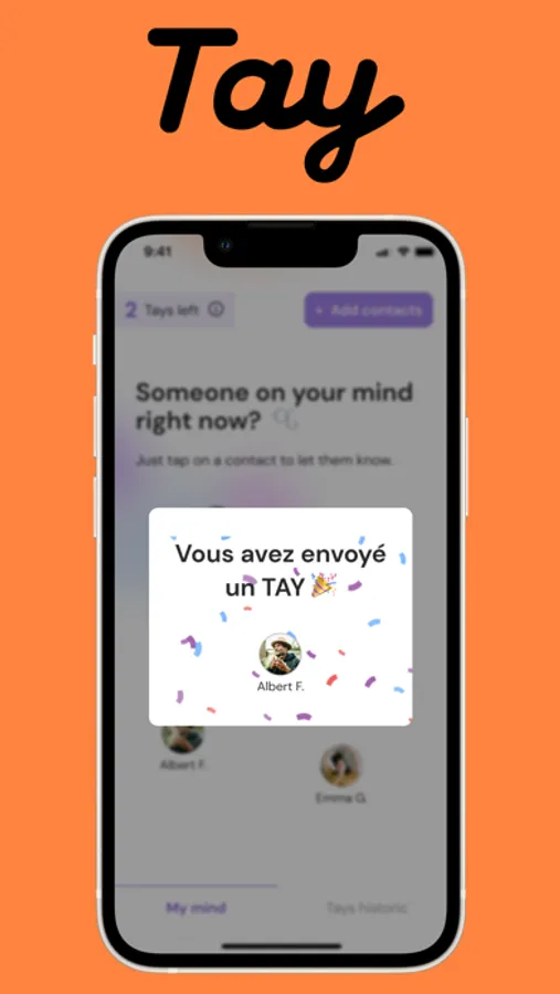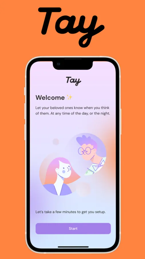 Avec TAY, vous pouvez envoyer une notification une fois par jour à l'une des personnes que vous aimez, pour leur faire savoir que vous pensez à elle. Que ce soit votre partenaire, un membre de votre famille ou un ami proche, l’application rend facile l'envoi d’un TAY pour illuminer la journée de quelqu'un.
