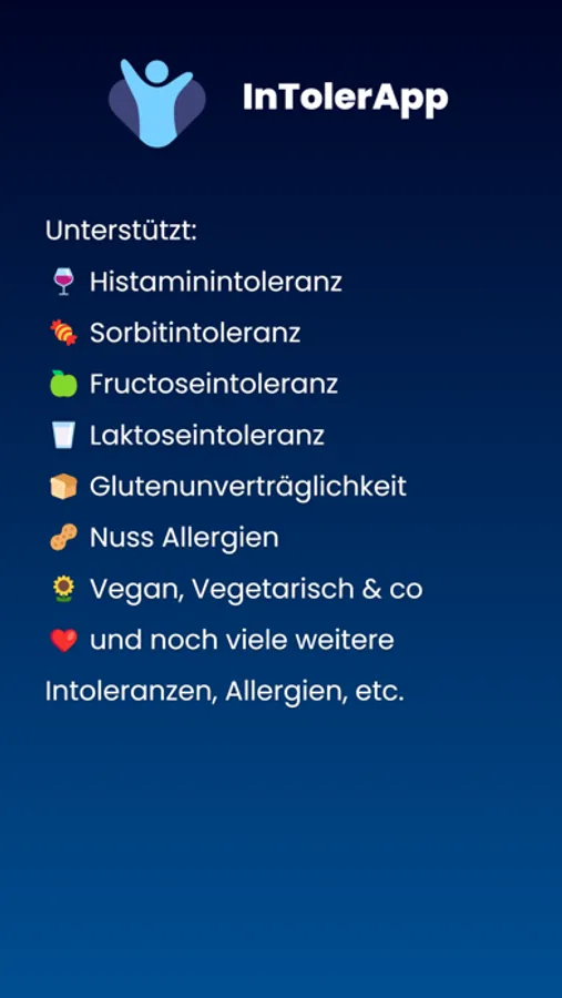 Haftungsausschluss: Die in der InToler App bereitgestellten Informationen und Empfehlungen dienen ausschließlich zu Informationszwecken und ersetzen in keinem Fall den Rat oder die Diagnose eines qualifizierten medizinischen Fachpersonals. Die Nutzung der App erfolgt auf eigene Verantwortung des Nutzers. Es wird keine Haftung für die Richtigkeit, Vollständigkeit und Aktualität der in der App bereitgestellten Informationen übernommen. Bei gesundheitlichen Beschwerden oder Fragen im Zusammenhang mit Nahrungsmittelunverträglichkeiten und Allergien empfehlen wir, stets den Rat eines Arztes oder anderer medizinischer Fachkräfte einzuholen, bevor Entscheidungen auf Grundlage der App getroffen werden.