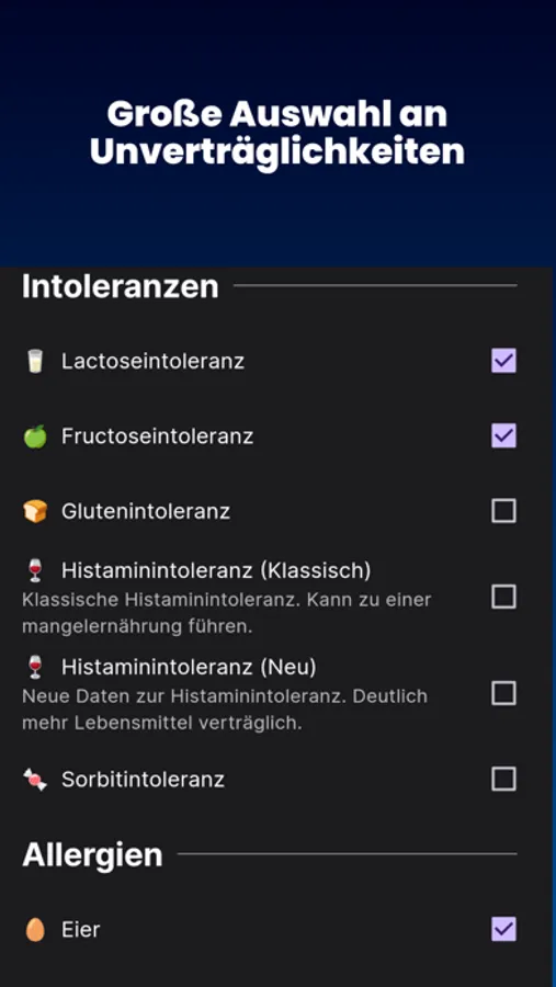 Die InTolerApp - Histamin Scanner erkennt eine Vielzahl von Unverträglichkeiten, darunter: