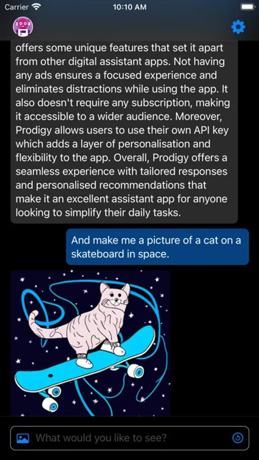 Introducing Prodigy, the AI assistant that offers you complete control over your chat experience. You can chat with an assistant trained on the latest Open AI model*, or generate images whenever you like!