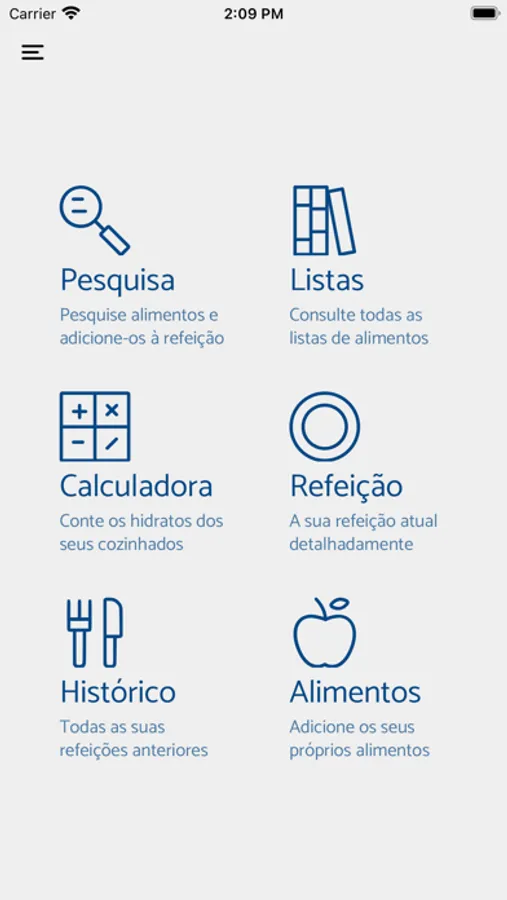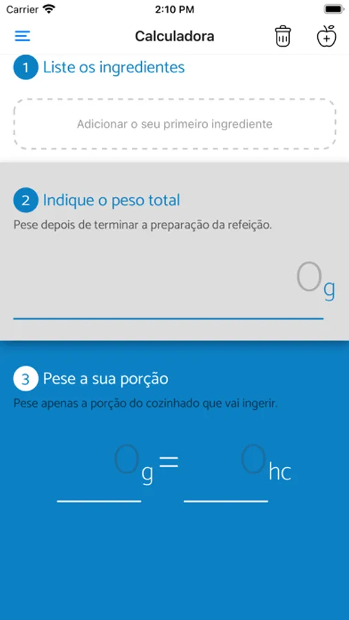 Inclui outras ferramentas como a Criação de alimentos próprios, Histórico de refeições ou Calculadora de hidratos para cozinhados próprios.