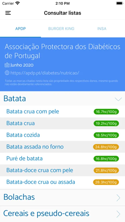Ferramenta de ajuda no controlo da diabetes com 10 tabelas nutricionais portuguesas.