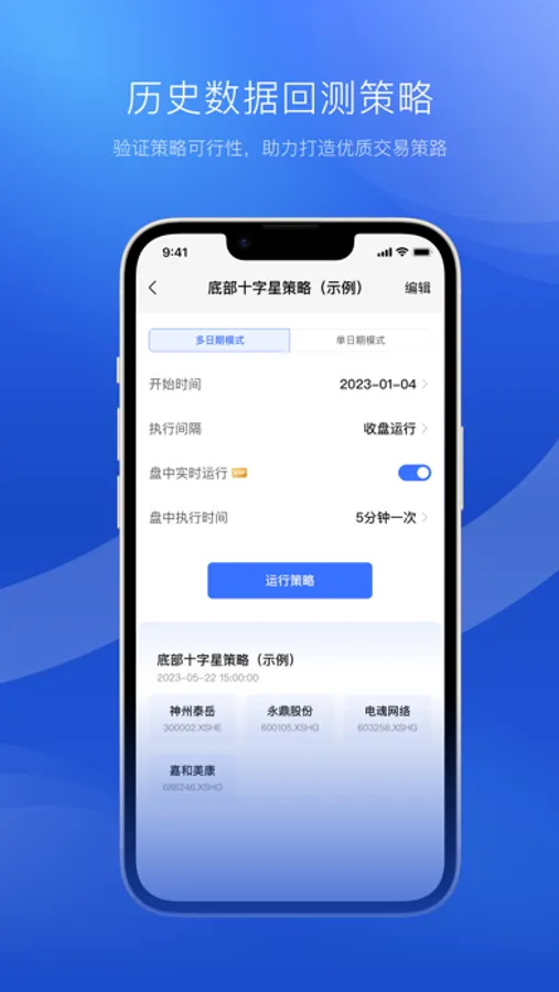 我们是不是常常会有灵感,出现某种走势的股票接下来会大涨?我们可以将这样的走势写成选股策略,设置一个特定的执行时间,例如,我们有一个隔夜套利策略A,我们设置在过去某年某月某日任意一天去执行它,看它选择出的股票在第二天的走势是否符合我们的预期,如果在大量的测试下都显示它的确在第二天大概率盈利,那么我们就收获了一个有效的策略。如果在测试中,发现第二天的走势并不符合预期,那么说明我们之前的想法可能是由于片面的信息导致了错误的认知。这样就替我们节省了大量的时间,不需要真金白银且花掉大量时间去实盘交易才能证实一个想法或交易方式是否有效。