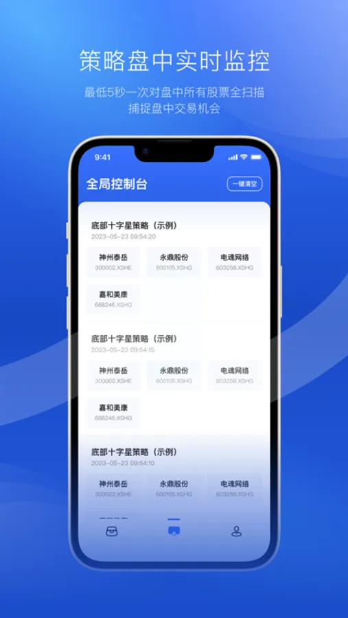 量化选股大师可以在开盘时间段内,不断地运行我们的选股策略,达到对盘面实时监控的目的。无论多么专业的人拥有多少个电脑屏幕,都比不上计算机的监控能力。在盘中任意时刻出现我们需要的走势,量化选股大师都可以立即捕捉到并显示出结果,各种短线妖股,高频交易均可以轻易实现。