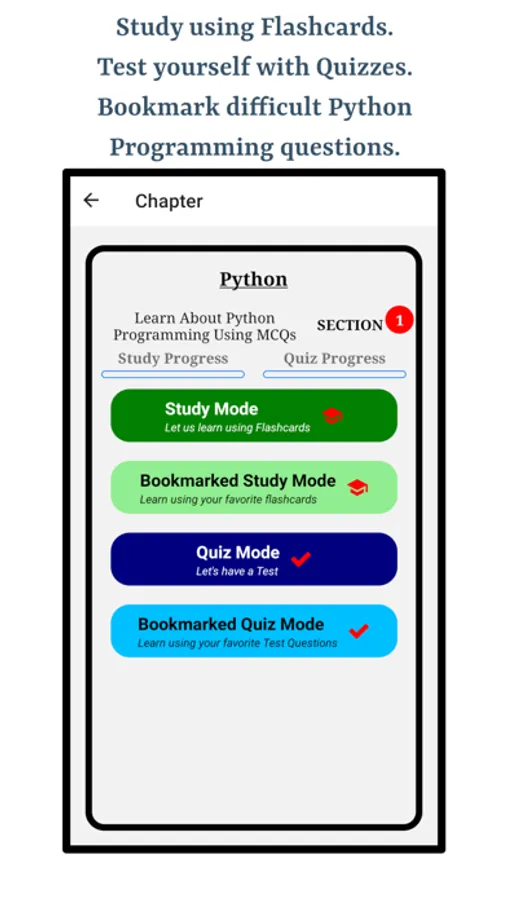 This app is a great resource to learn about Python Programming Language. The app is engineered to make users perfect understanding common Python Programming Language questions by studying for a very short amount of time. Audio functionality and bookmarking is available throughout the app on chapter, section, study mode and quiz modes.
