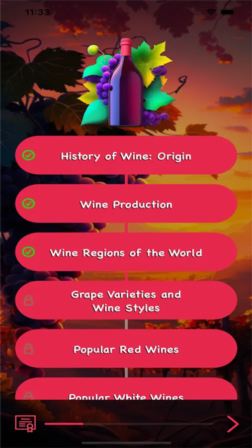Explore the world of wine with our comprehensive Wine School app! From the origin of wine to popular red wines, our lessons cover everything you need to know to become a wine connoisseur. Discover the different types of wines, learn how aging of wine is done, and explore popular vineyards around the world. After each lesson, test your knowledge with our quizzes, and track your progress with our completion bar. Whether you're a wine enthusiast or just starting your wine journey, our Wine School app has something for everyone. Stay tuned for new versions of our app, which will include even more lessons to help you become a true wine expert!