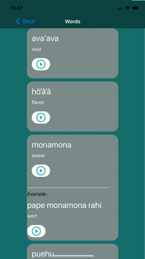 Whether you're a first-time learner or a seasoned enthusiast, Tahuarama makes it easy for you to keep track of all the new words and phrases you'll encounter during your Tahitian adventures. With Tahuarama, you can navigate easily between different immersion themes, from words to full sentences, and practice pronunciation with audio for all vocabulary items.