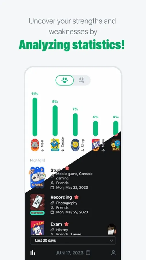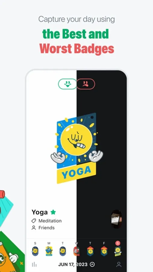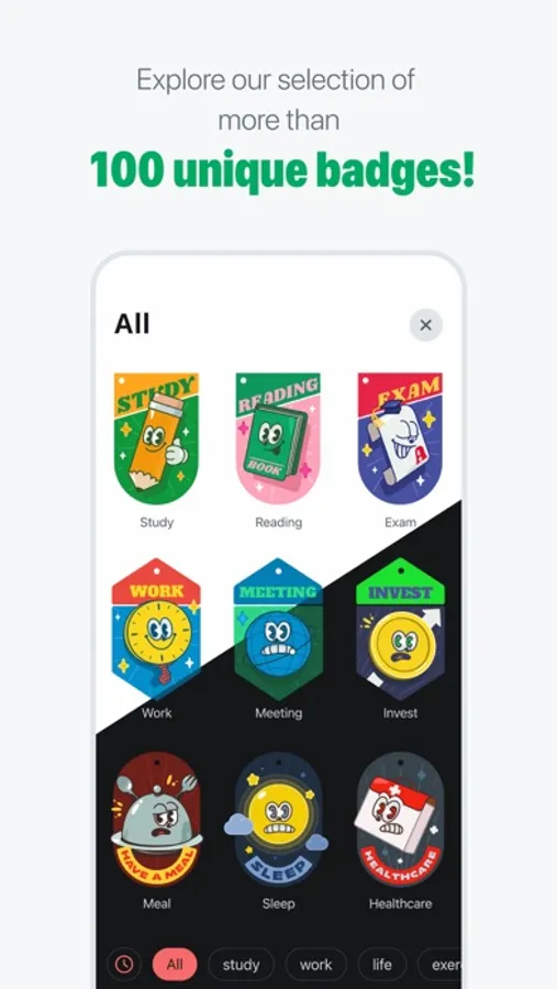 Through the adorable and lovely badges each day, record your most amazing achievements and the things you find most regrettable. The more you record, the more you can feel satisfaction in which areas, what kind of life you are living, and what values you consider important!