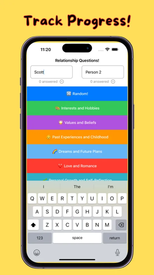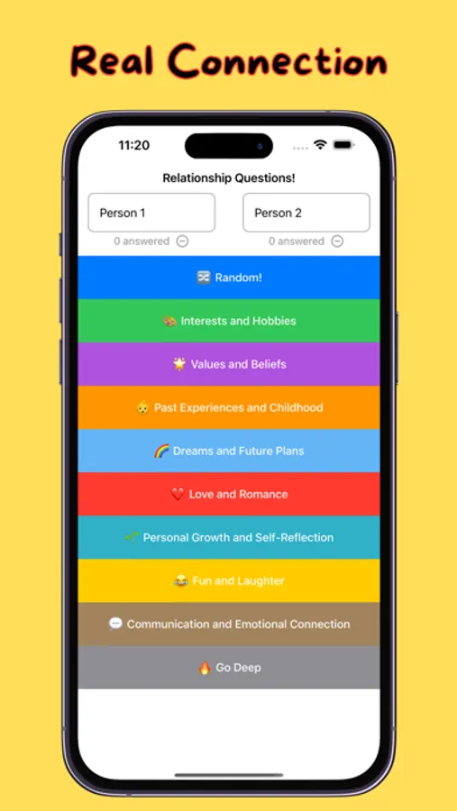With "Relationship Questions," you can personalize the experience by inputting your names and keeping track of who has already answered each question. Choose to ask random questions from all categories or stick to specific ones that interest you the most.