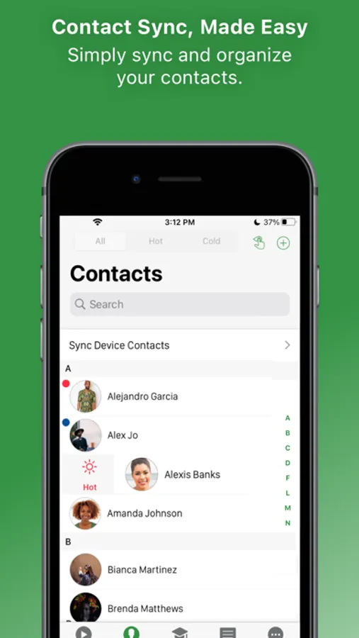 Contacts: Choose how to sync and manage your contacts. Swipe to sort them by interest level. You can make connections, add notes, or check out the Contact Feed to see the tools you’ve shared and contact actions.