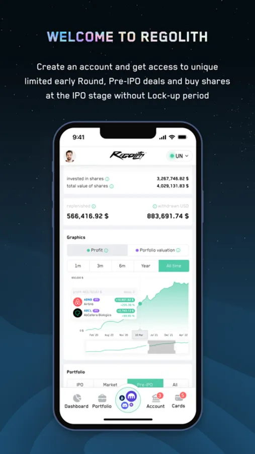 Download the investing app Regolith right now! Exploit the investment opportunities of Pre-IPO, ventures and startups, Blockchain Web3 projects, commodity and real estate funds. Build a well-balanced financial portfolio of high potential!