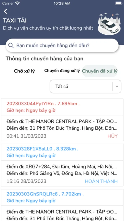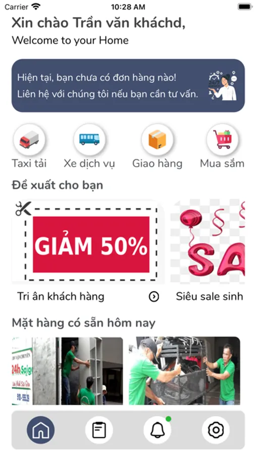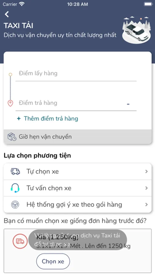 Đặt dịch vụ taxi tải ngay lập tức hoặc theo ngày giờ hẹn, hệ thống tư vấn xe phù hợp với lượng đồ đạc chuyển hàng. Khách hàng kết nối với tài xế nhanh chóng và đơn giản.