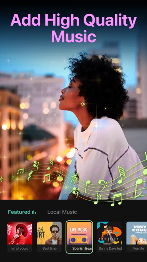 Choose from a regularly updated selection of curated music or select your own local music. You can even extract music from videos or add music through AirDrop with fade-in and fade-out options. Music styles include rock, country, love, and beats, etc.