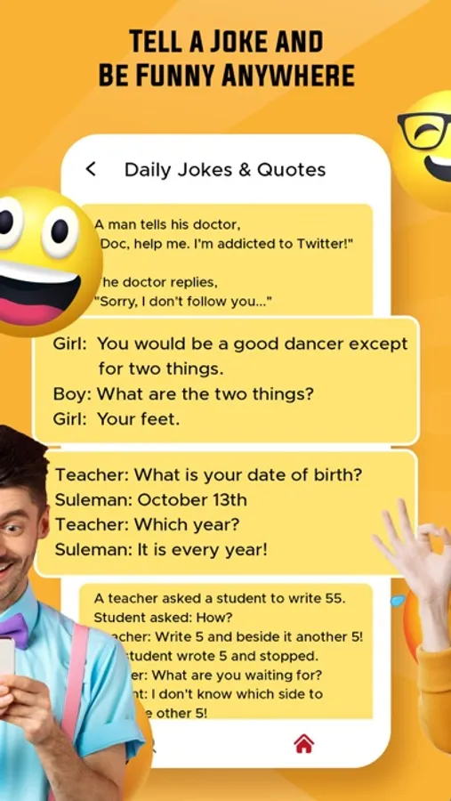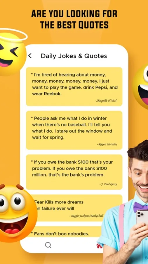 Daily Jokes Quotes is an app that provides its users with a daily dose of humor and inspiration. The app consists of a collection of 365 jokes and quotes, one for each day of the year. Users can access the app on their mobile devices and receive a new joke or quote every day.