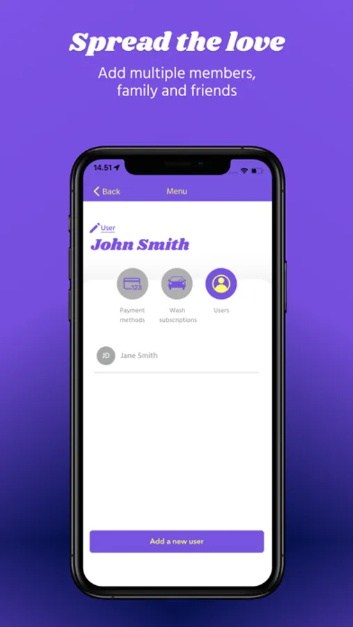 - Pay for individual washes in app through credit or debit card