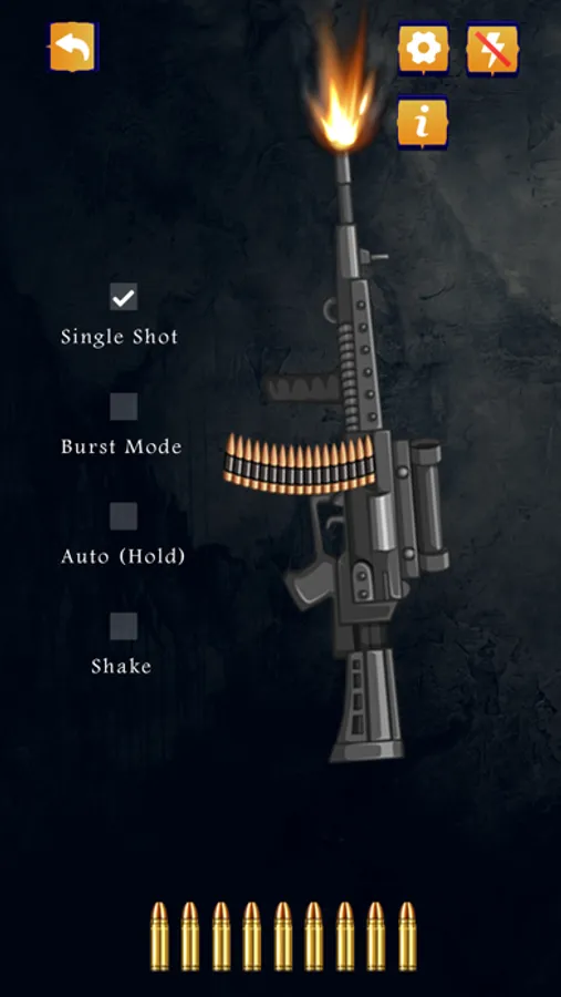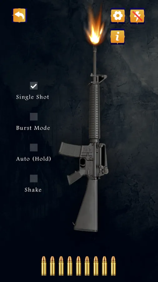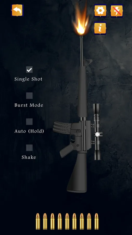 In Gun Shooting: Gun simulator, different shooting styles are available. Single shot, burst mode, auto(hold)mode and shake mode of gun shooting is available. In a single shot - you have to touch every time for the shoot. In Burst mode - you touch one time and the gun will shoot 3 or 4 times. In Auto(hold) mode - you have to touch and hold the gun for gun shooting. In the shake mode of gun shooting, you have to shake the phone and the gun will shoot.