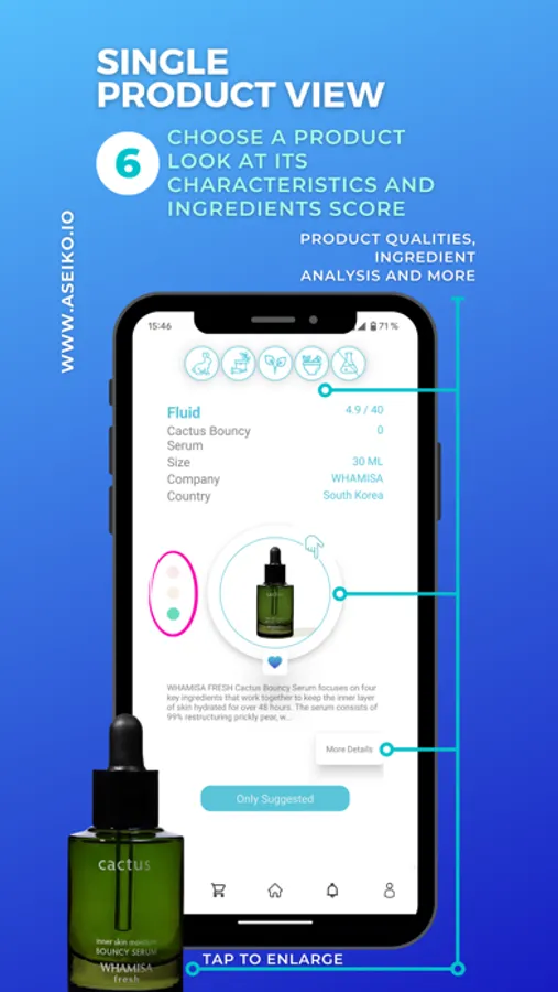• View any time ALL YOUR MATCHING SKINCARE PRODUCTS RECOMMENDED BY ASEIKO SKIN® (“Only Suggested”), incl. important additional characteristics and details (vegan, eco-friendly packaging, cruelty free, natural ingredients and more).