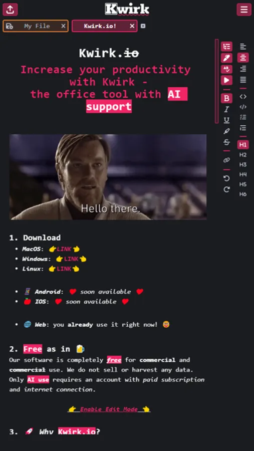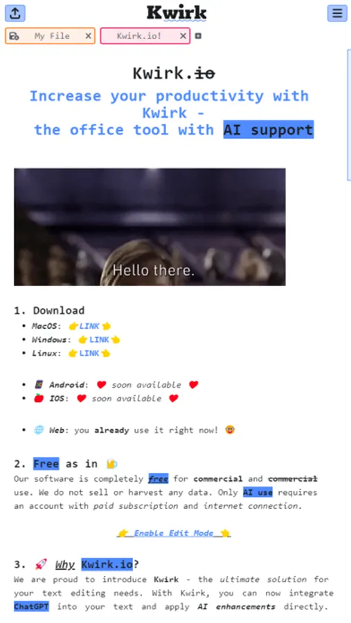 With its next-gen AI technology, Kwirk is designed to help you write better and faster than ever before. Whether you're a professional writer or just someone who loves to jot down their thoughts, Kwirk has everything you need to take your writing game to the next level.