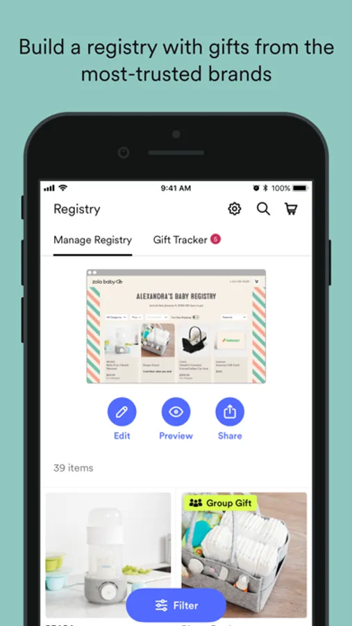 With the Zola Baby app, you can register for everything you need to prepare for your little one’s arrival. Shop a curated selection of the most popular gifts from the most trusted brands. Add gifts from any other store onto one registry that’s easy for your friends and family to shop. Add zero-fee cash funds for everything from diapers to college tuition. Get a personalized checklist to make sure you have everything you need. Plus, count down the exciting weeks until your little one’s arrival!