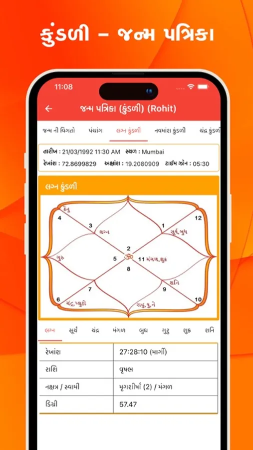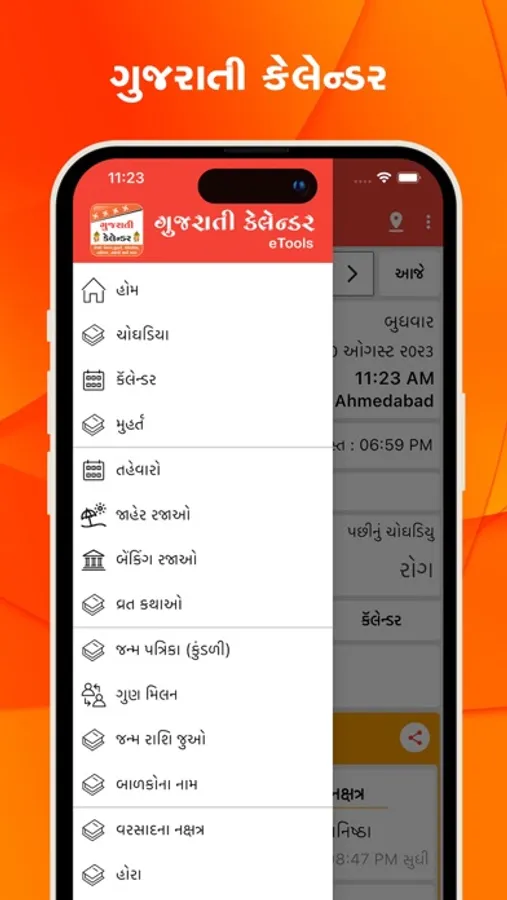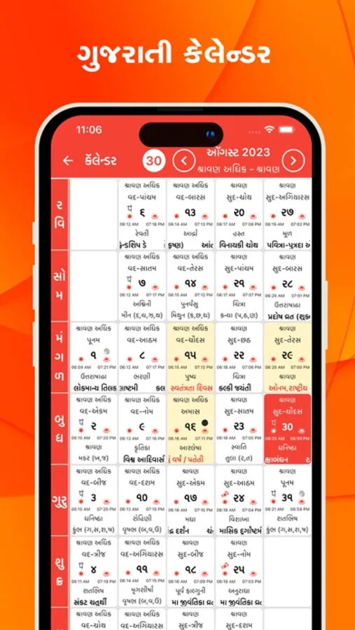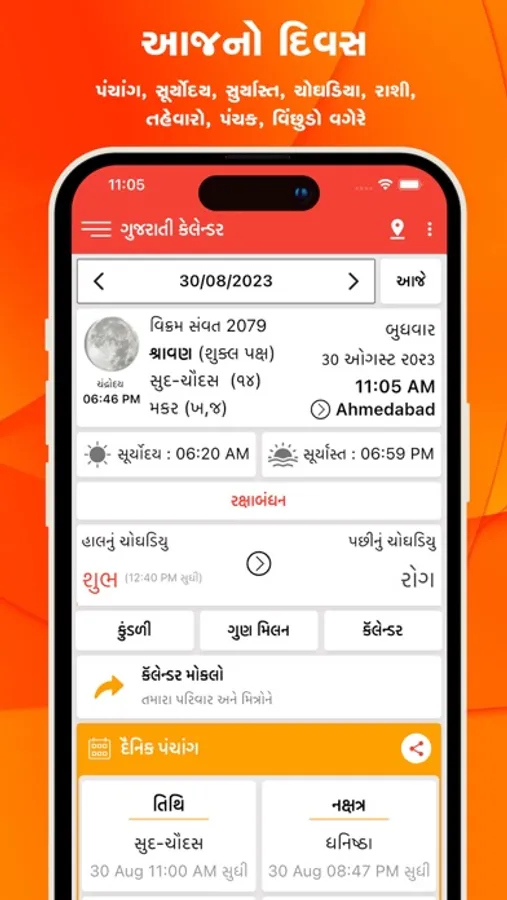 You can view today's Tithi, Nakshatra, Yoga, Karan, Choghadiya, Sunrise, Sunset, SunSign, MoonSign, Festival and holidays on one screen.