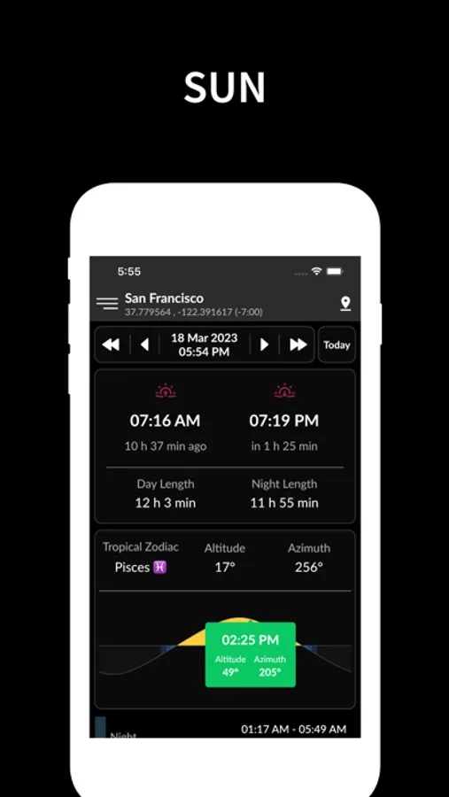 • View azimuth and altitude of sun/moon for any time of day/night