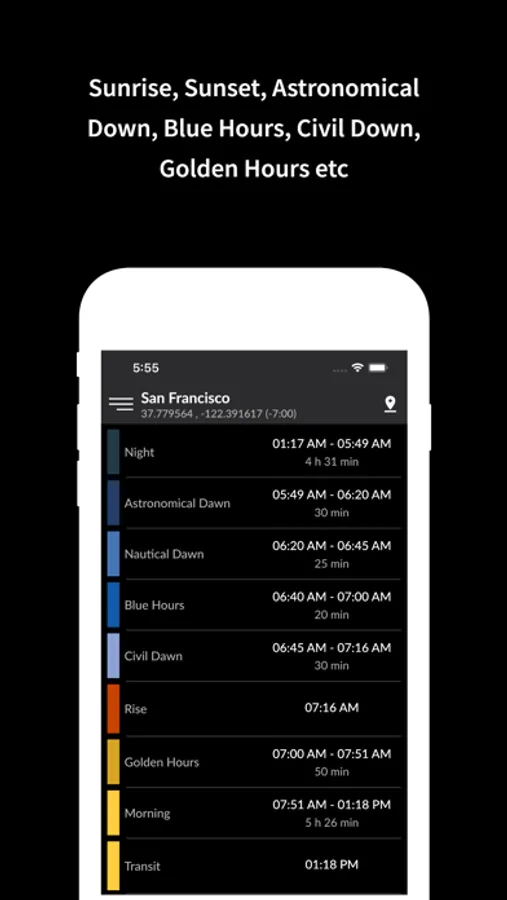 Our application is used to determine the position of sun and moon anywhere in the world, and help you determine the time of sunrise and sunset, twilight, the duration of the day, moon phase and much more.