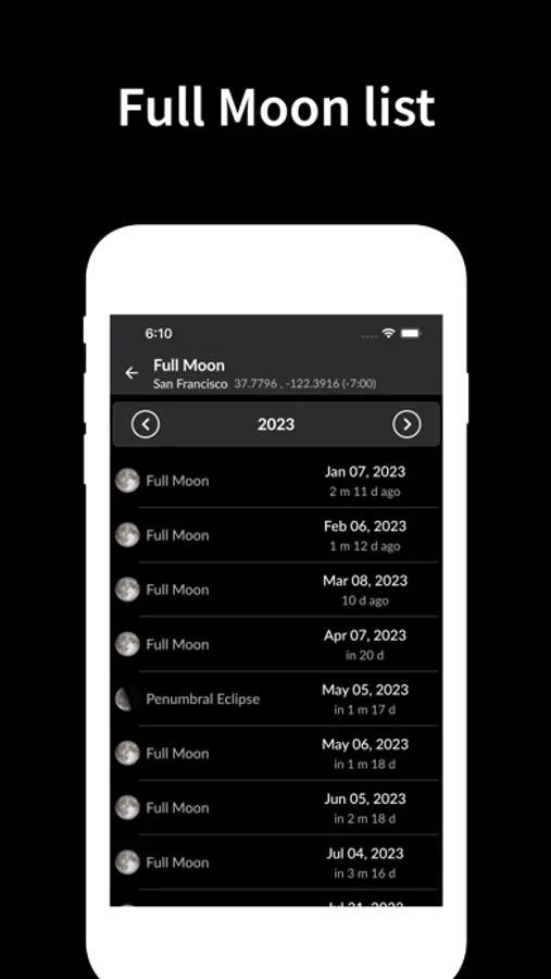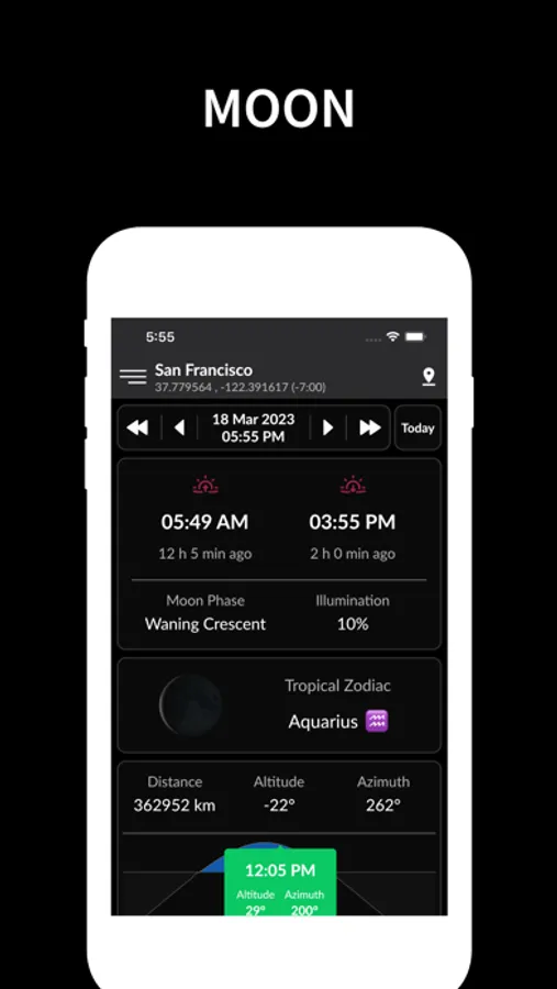 • Lunar phase (new moon, full moon, crescent moon, first quarter) and illumination