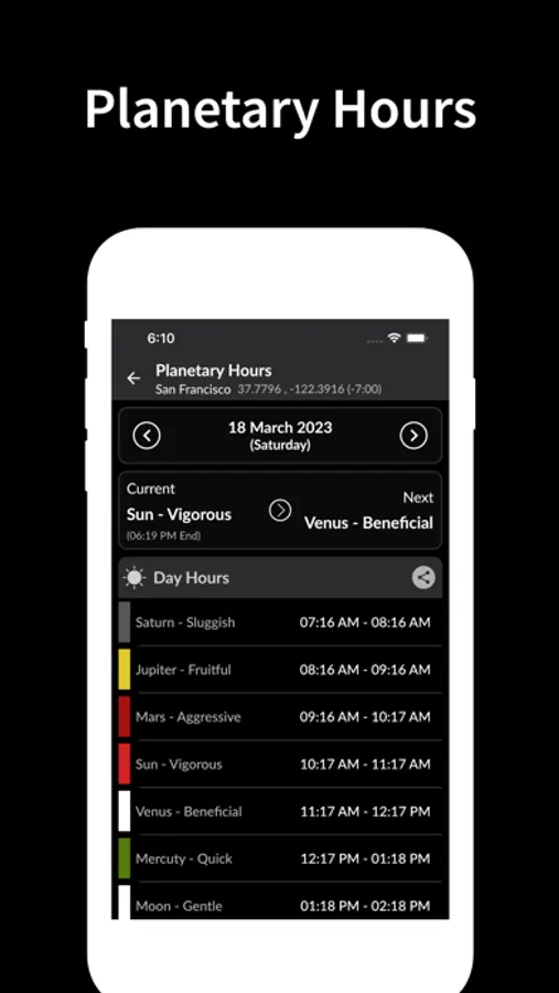 - Information about golden and blue hours for each day