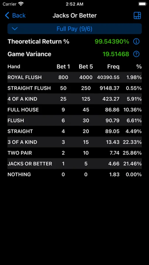 - Analyze any game and pay schedule with the powerful calculator. You can see the return, variance, etc., for about 100 popular games.