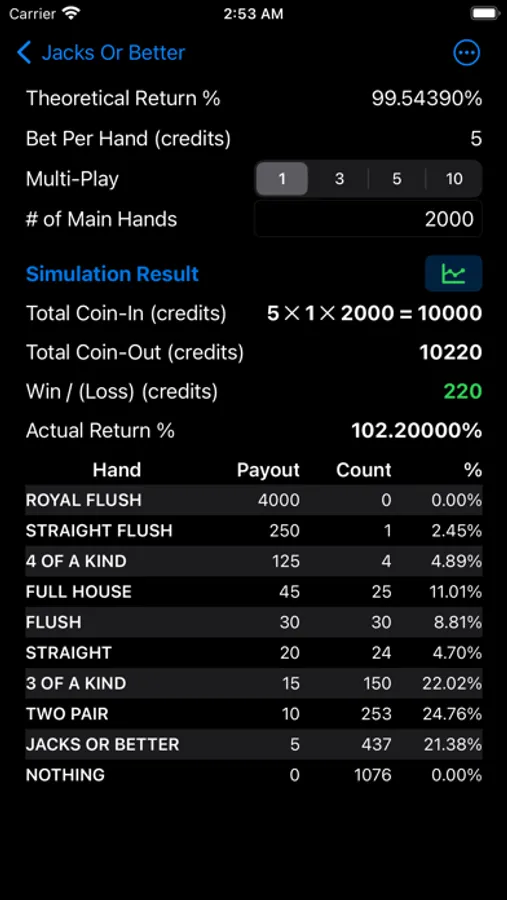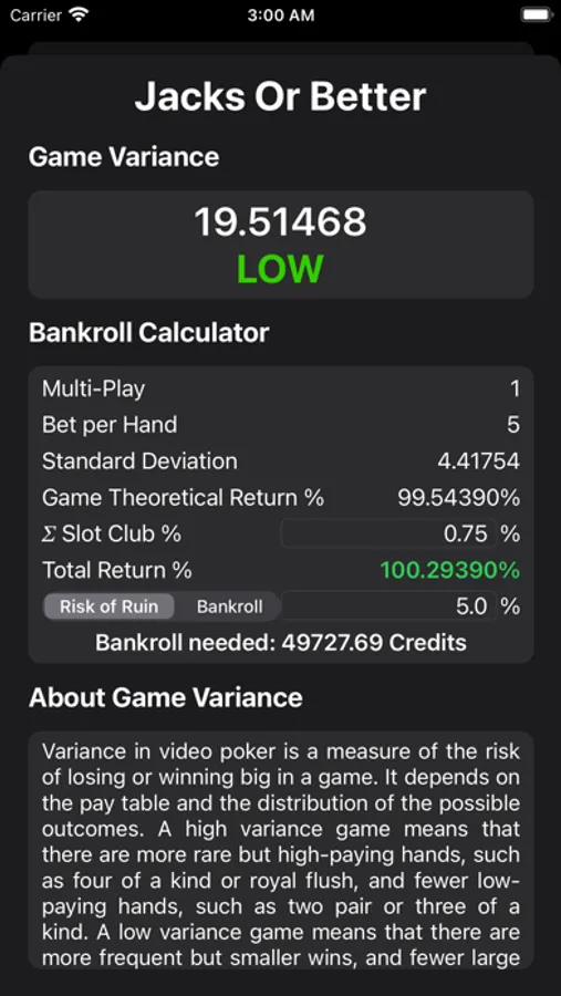 - Plan your trip with the bankroll calculator. You can input your desired game, pay schedule, bet size, etc. The app will tell you the optimal bankroll size, risk of ruin, and expected value.